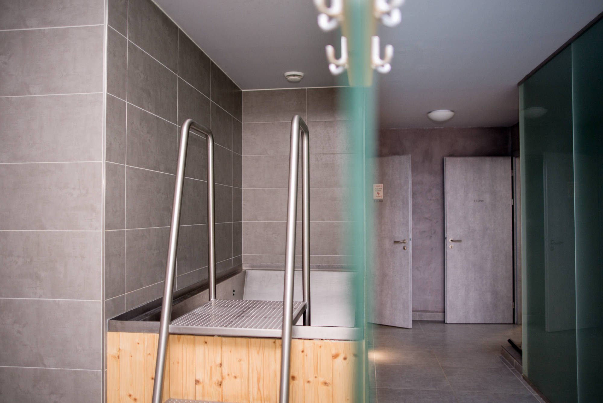 Pro zchlazení po pobytu v prohřívací místnosti lze využít buď ochlazovací nerezový bazének o hloubce 80 cm či sprchový kout.